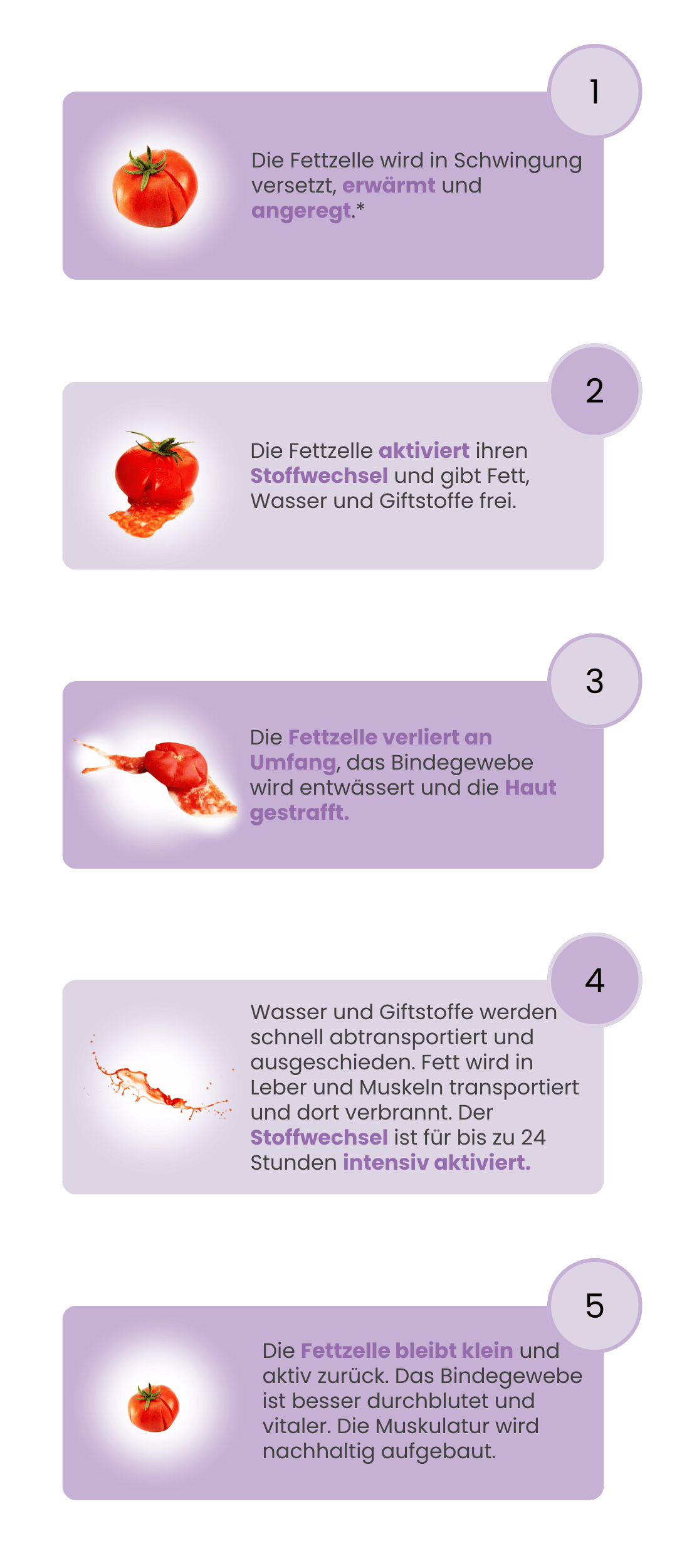 "In unserem Körper gibt es viele Fettzellen. Stell dir jetzt vor, diese schauen aus wie Tomaten. Bei unserer Methode bearbeiten wir die Tomaten bzw. Fettzellen mit Strom, Ultraschall und Wärme."